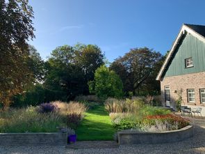 Toen wij hier kwamen wonen, was de tuin sterk verwilderd. Inmiddels is er, op een open veld van circa 2000 m² onder oude kastanjebomen, een prairietuin ontstaan naar ontwerp van Carien van Boxtel – geïnspireerd op de stijl van Piet Oudolf en onze jaren in de Verenigde Staten.